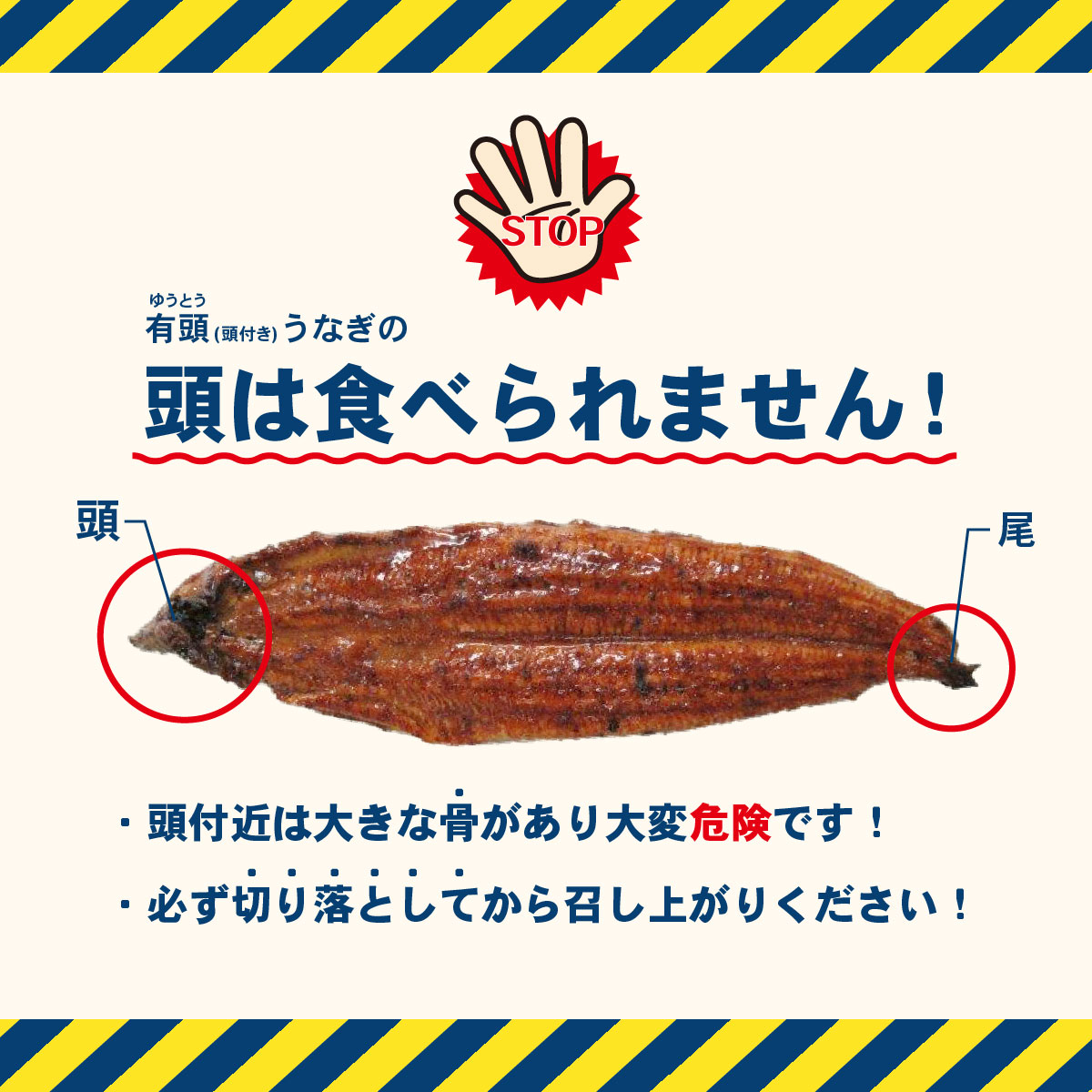 | 調理方法 | レンジで温めてください。有頭うなぎの場合は必ず頭部分を切り落としてお召し上がりください。水産物の性質上、除去しきれない小骨がありますのでお召し上がる際はご注意ください。(食べ方付きリーフレット同封) |