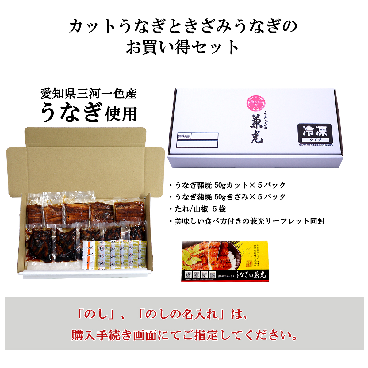 内容 | きざみうなぎ蒲焼 50g(うなぎ30g+注入タレ20g)×5パック うなぎ蒲焼カット 50g×5パック タレ・山椒5袋付 |