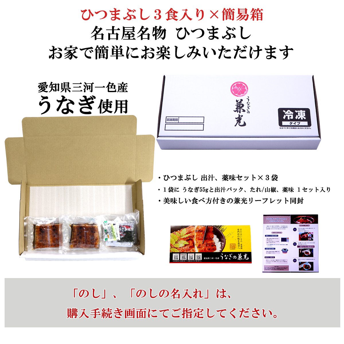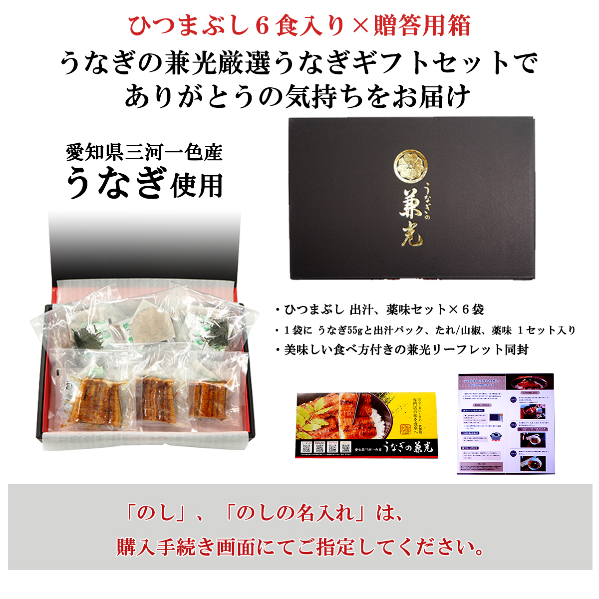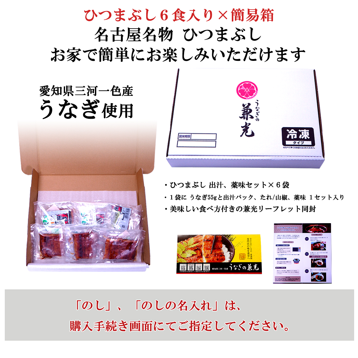 | 内容 | 6食入りの場合 ひつまぶしセットのパック(きざみうなぎ55g、たれ・山椒1袋、きざみ海苔1袋、きざみねぎ1袋、生わさび1袋、出汁パック1袋)×6パック 3食入りの場合 ひつまぶしセットのパック(きざみうなぎ55g、たれ・山椒1袋、きざみ海苔1袋、きざみねぎ1袋、生わさび1袋、出汁パック1袋)×3パック |