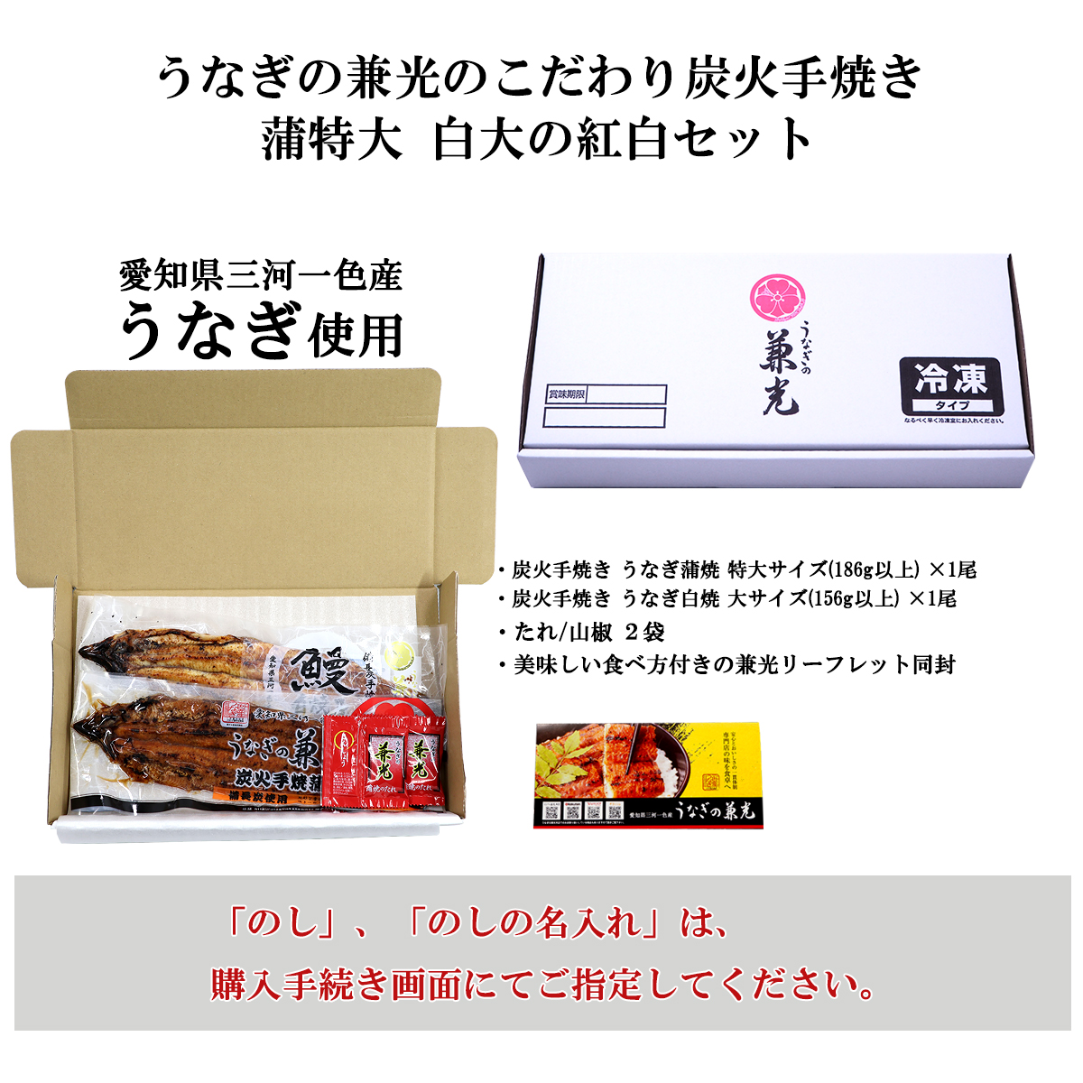 | 原材料 | 炭火うなぎ蒲焼き うなぎ(愛知県三河一色産)、 しょうゆ(小麦・大豆を含む)、還元澱粉糖化物、ぶどう糖果糖液糖、みりん、食塩、澱粉/酒精、着色料(カラメル、紅麹) 炭火うなぎ白焼き うなぎ(愛知県三河一色産)、 添付タレ たれ(しょうゆ(小麦・大豆を含む、国内製造)、還元澱粉糖化物、ぶどう糖果糖液糖、みりん、食塩、澱粉/酒精、着色料(カラメル、紅麹))、添付(さんしょう) |