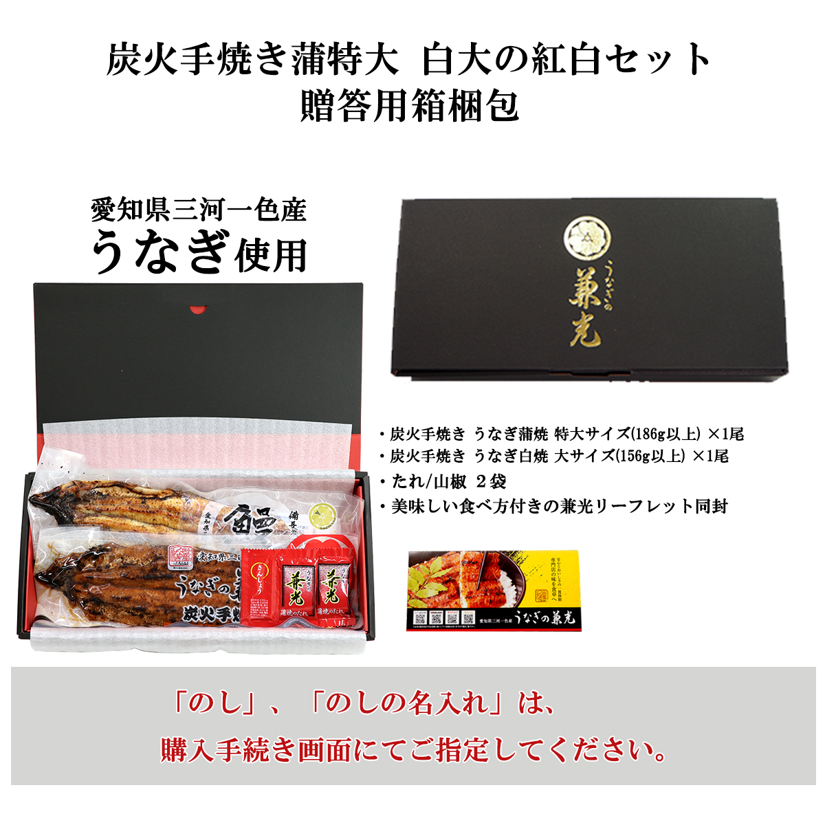 蒲焼170g前後と白焼150g前後の場合 炭火手焼き うなぎ蒲焼 有頭腹開き 156g~185g ×1尾 炭火手焼き うなぎ白焼 有頭腹開き 136g~155g ×1尾 タレ・山椒2袋付 蒲焼186g以上と白焼156g以上の場合 炭火手焼き うなぎ蒲焼 有頭腹開き 186g以上 ×1尾 炭火手焼き うなぎ白焼 有頭腹開き 156g以上 ×1尾 タレ・山椒2袋付 |
