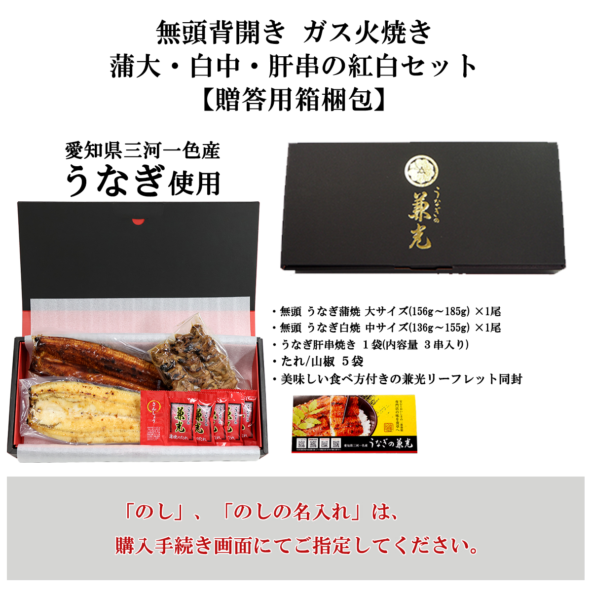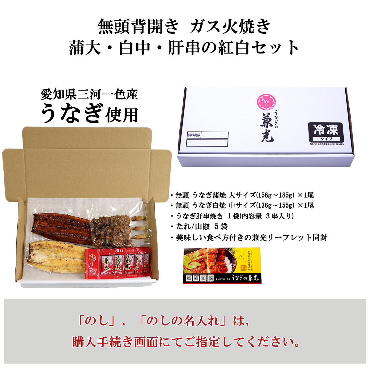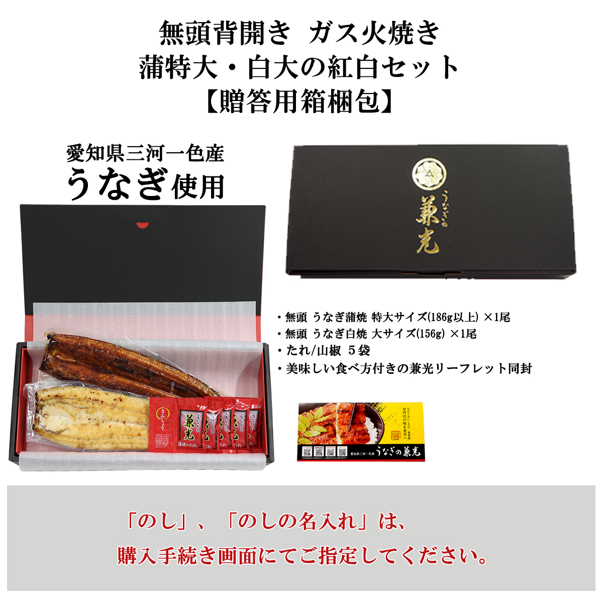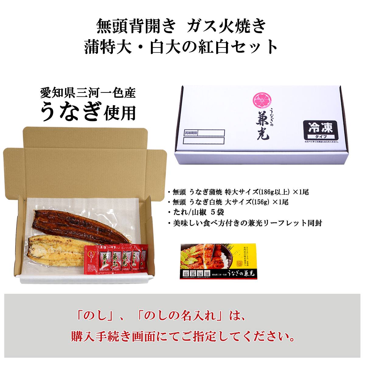 蒲特大・白大のセットの場合 うなぎ合計380g前後 無頭うなぎ蒲焼×1尾(186g以上) 無頭うなぎ白焼×1尾(156g以上) タレ・山椒5袋付 蒲大・白中・肝串のセットの場合 うなぎ合計300g前後 無頭うなぎ蒲焼×1尾(156g~185g) 無頭うなぎ白焼×1尾(136g~155g) 肝串焼き3本入り×1パック タレ・山椒5袋付 |