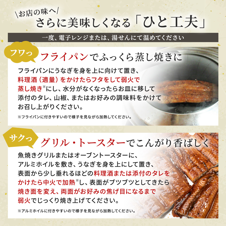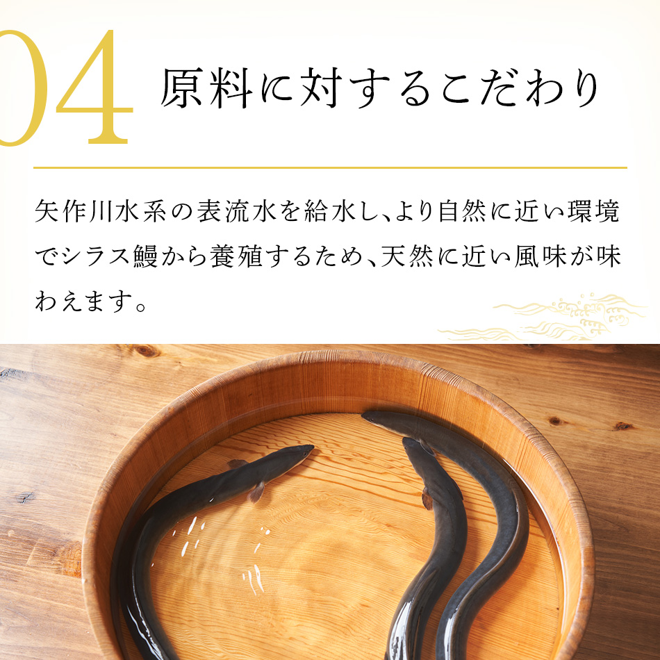 | 原材料 | うなぎ蒲焼き うなぎ(愛知県三河一色産)、 しょうゆ(小麦・大豆を含む)、砂糖、砂糖混合異性化液糖、発酵調味料、水あめ、食塩、うなぎエキス/酒精、着色料(カラメル、クチナシ、紅麹)、調味料(アミノ酸等)、増粘剤(加工澱粉、増粘多糖類) うなぎ白焼き うなぎ(愛知県三河一色産) うなぎ肝串焼き うなぎ肝(愛知県産)、しょうゆ(小麦・大豆を含む)、砂糖、砂糖混合異性化液糖、発酵調味料、水あめ、食塩、うなぎエキス/酒精、着色料(カラメル、クチナシ、紅麹)、調味料(アミノ酸等)、増粘剤(加工澱粉、増粘多糖類) 添付タレ たれ(しょうゆ(小麦・大豆を含む、国内製造)、還元澱粉糖化物、ぶどう糖果糖液糖、みりん、食塩、澱粉/酒精、着色料(カラメル、紅麹))、添付(さんしょう) |